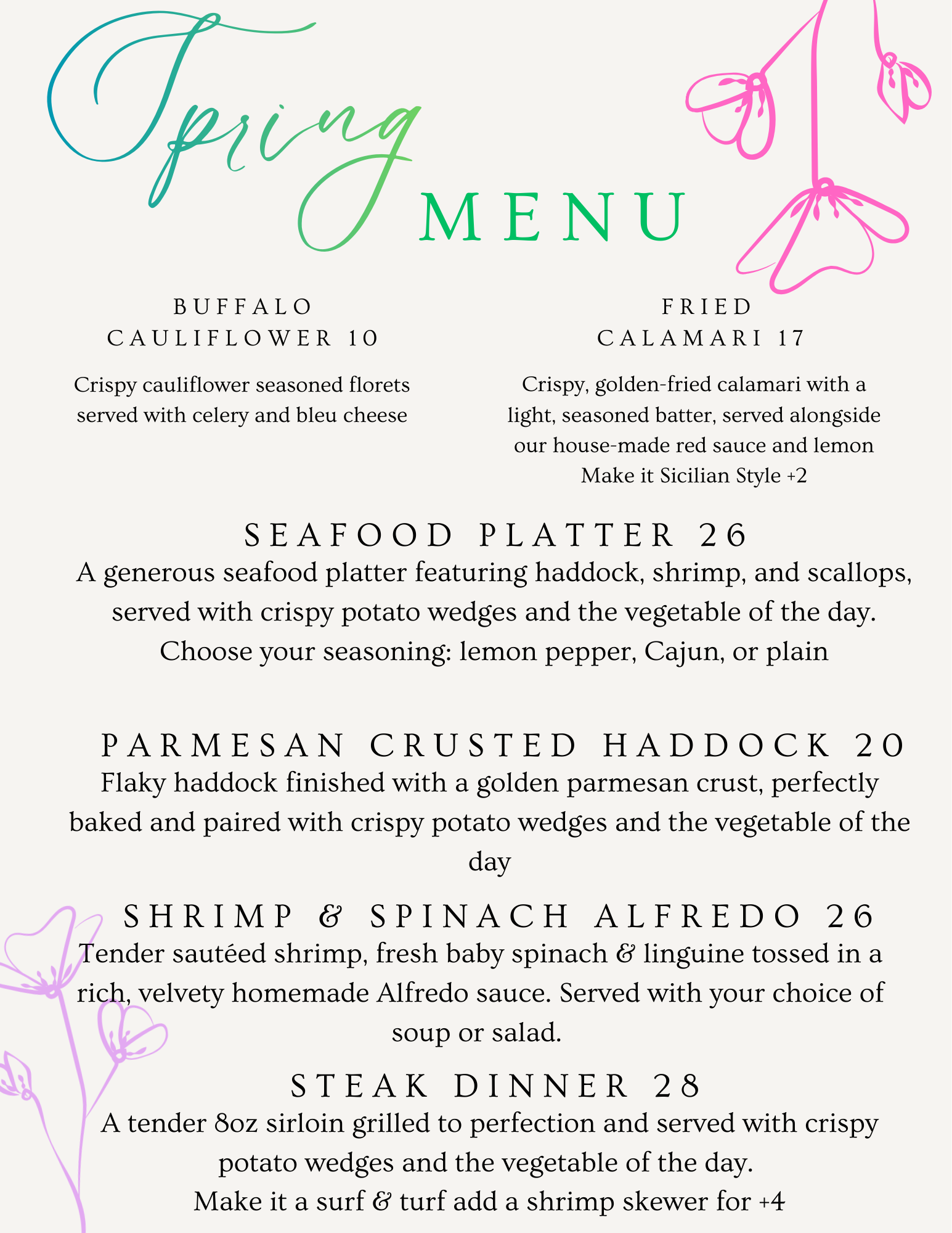 My husband had the salad special which was excellent. I had ravioli and friends had pasta dishes. Excellent, plentiful dishes.